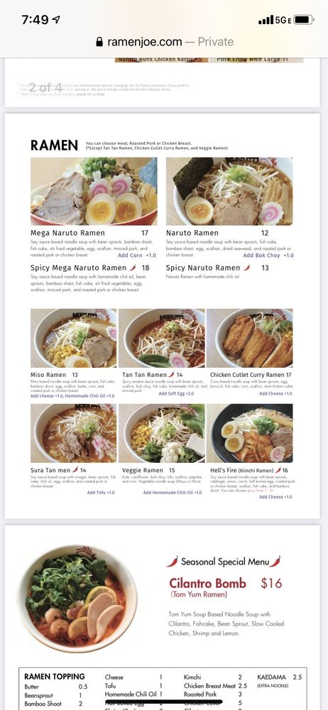 Soy sauce-based noodle soup with bean sprouts, cabbage, onion, carrots, soft boiled marinated egg, scallion, fishcake, bamboo shoots, and roasted pork or chicken breast. Choose level 1~5. Pork and chicken broth