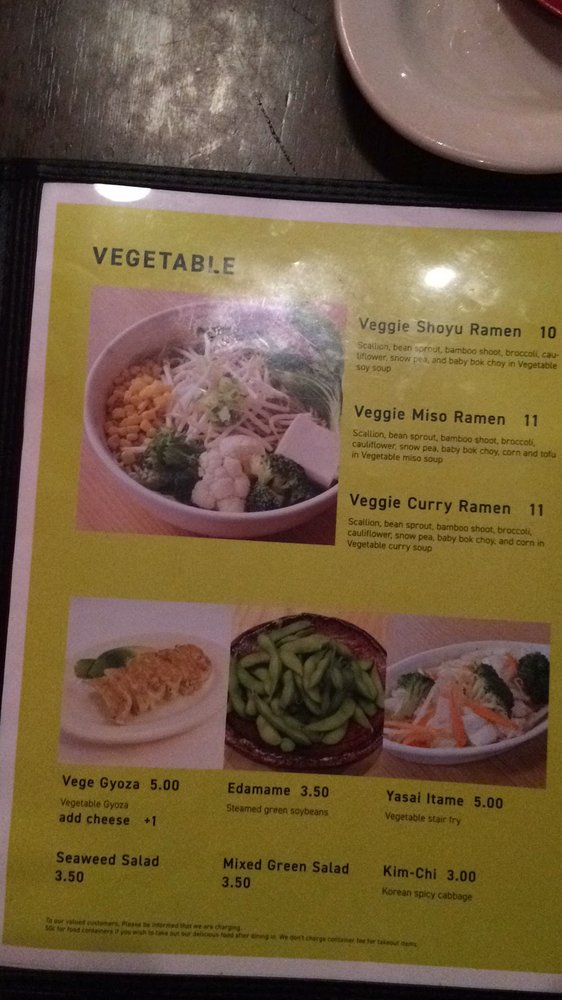 Vegetable based noodle soup with broccoli, bamboo shoots, bean sprouts, corn, tofu, scallion and bok choy. Shoyu flavor