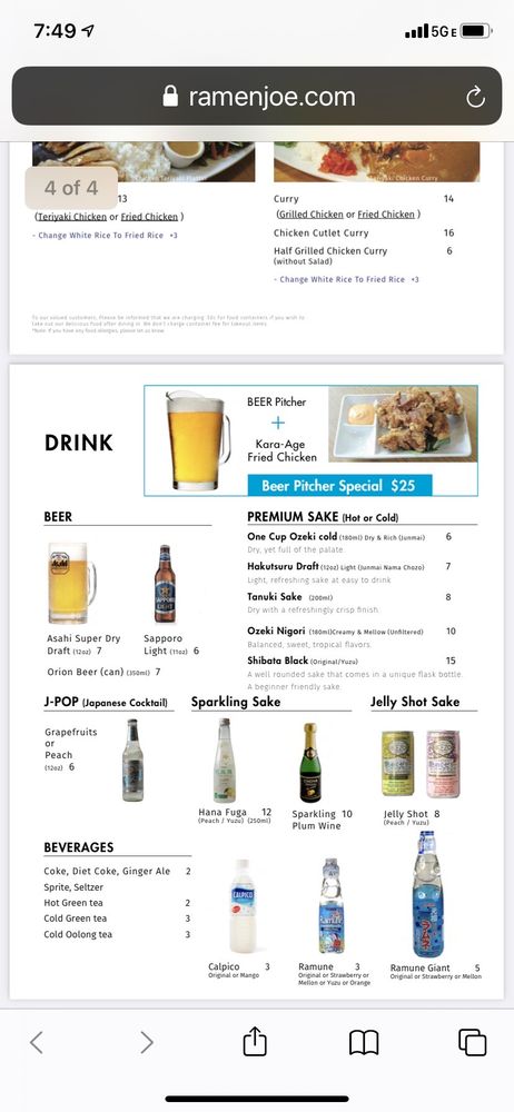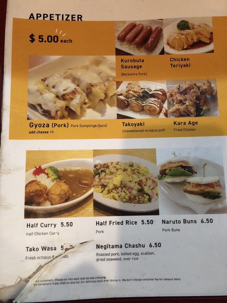 Curry based noodle soup with fish cake, scallion, corn, bamboo shoot, marinated soft boiled egg, roasted pork, and bean sprouts. Pork and chicken broth. Choice of a small appetizer
